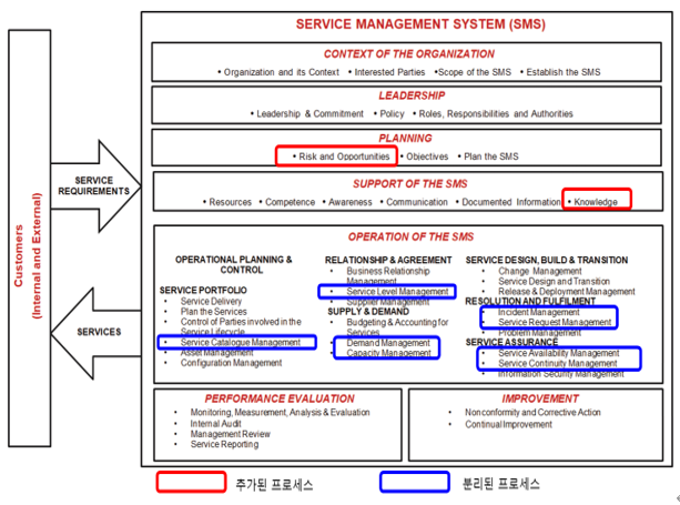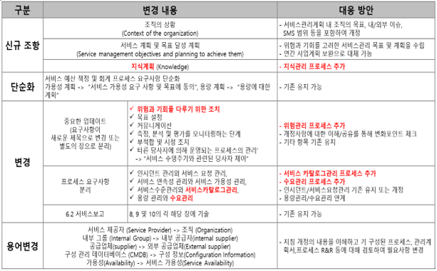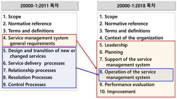 The nine clauses in the 2011 version have been revised to ten clauses in the 2018 version to comply with Annex SL. Most process-related content from Chapters 5–9 has moved to Chapter 8: Operation of the Service Management System.