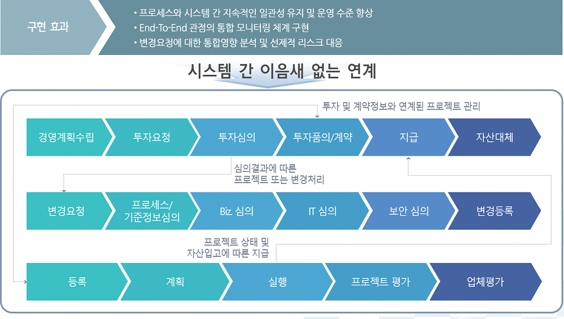 IT 투자비용- IT 투자비용에 대한 정보기획 업무를 예측하기 위한 체계확보 및 투자/비용 업무를 처리하기 위한 구조 개선- 경영계획 -> 투자 -> 품의 -> 계약의 End-To-End 업무 흐름 모니터링 기능 구현- 현업과 처리 부서 간 IT 투자비용 업무 흐름 공유 및 강화된 심의절차를 통한 업무 신뢰도 향상