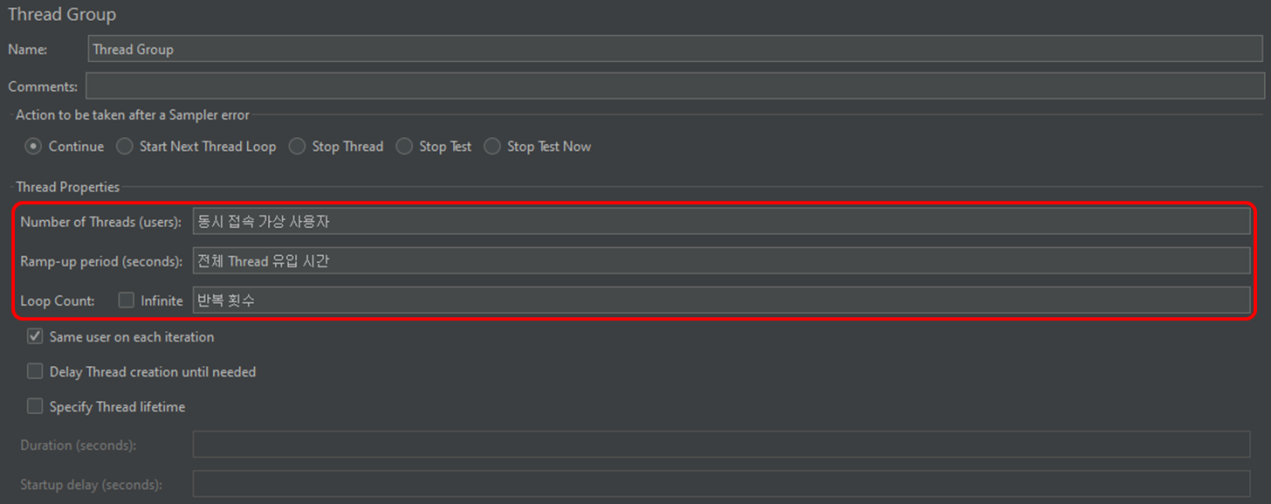 Jmeter 설정 중 Thread 수 (동지 접속 가상 사용자), Ramp-up(전체 Thread 유입 시간),