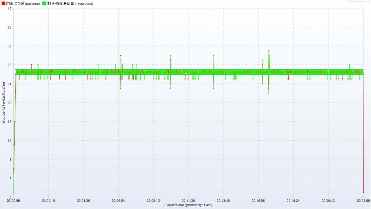성능 테스트 결과를 다양한 리포트 형식으로 도출 할 수 있는데 그 중에서 많이 사용하는 TPS 그래프와 종합결과(Summary Report)는 다음과 같다.