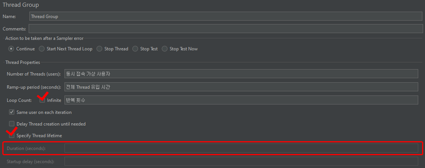 추가로 Thread 수를 목표치 보다 배수로 올리고 Loop Count(반복 횟수)는 무한으로 체크하여 임 계치 최대 성능을 측정할 수 있는 기능과