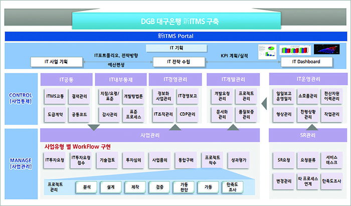 success_steg_DGB대구은행은 2006년 1월 IT관리 시스템(ITMS) 구축 후 노후화로 인한 요구사항 반영의 어려움과 시스템처리 속도 저하에 따른 재 구축이 필요하다는 운영 관점의 배경과, 품질관련 프로젝트 진행상황과 모니터링 기능의 개선 및 테스트시스템을 연계한 테스트 관리 강화의 일환으로 테스트시스템 통합이 필요하다는 개선관점의 배경이 발생하였다.이러한 배경을 기반으로 프로세스 Chain Model 기반 프로세스 연관성을 강화하고, 유관 기능을 통합하여 IT 업무 생산성을 향상하고, 지속적인 개선을 통한 IT 업무 효율성을 극대화함으로써, 궁극적으로 비즈니스-고객-서비스 가치 중심의 IT서비스 관리체계 마련을 위한 지속적 확대와 성장을 지원할 IT서비스 관리시스템을 구축 하였다.