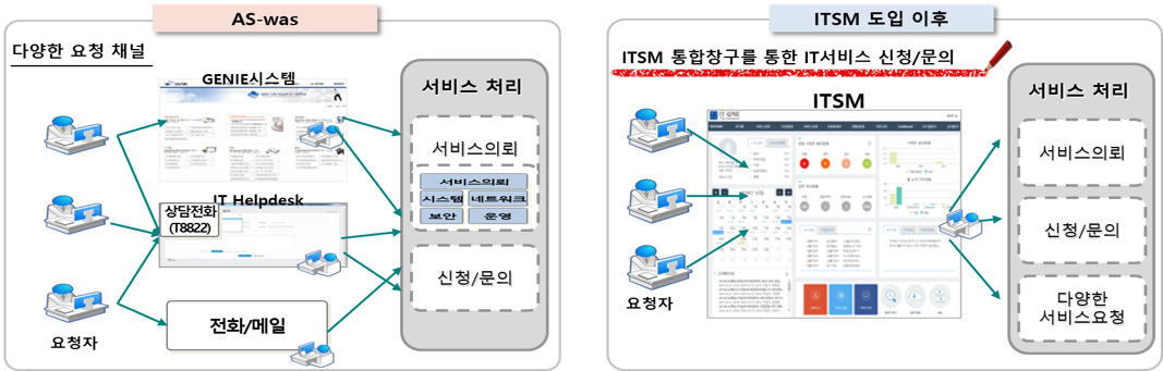 - IT관련 문의/신청 등의 서비스 요청 창구 단일화를 통한 사용자 편의성 향상- ITSM을 통한 빠르고, 쉬운 서비스 요청 및 처리되는 요청의 처리상태정보 제공