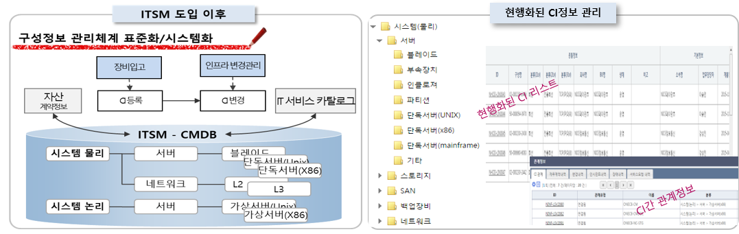 - 통합된 정보시스템 관리를 위한 CI 분류체계 통일과 관리절차 표준화- 계열사별 개별 관리하던 구성정보/카탈로그정보의 통합을 통해 현행화된 정보의 실시간 제공