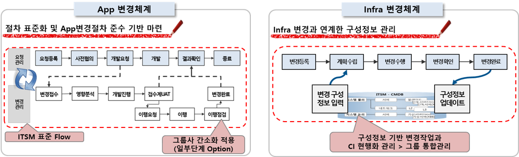 - App변경: 다양하게 운영되던 App 변경관리절차의 표준화 구현 및 계열사별 사용가능 한 Flow 옵션화- Infra변경: ITSM 내 현행화된 구성정보에 기반한 인프라 변경관리 절차 구현