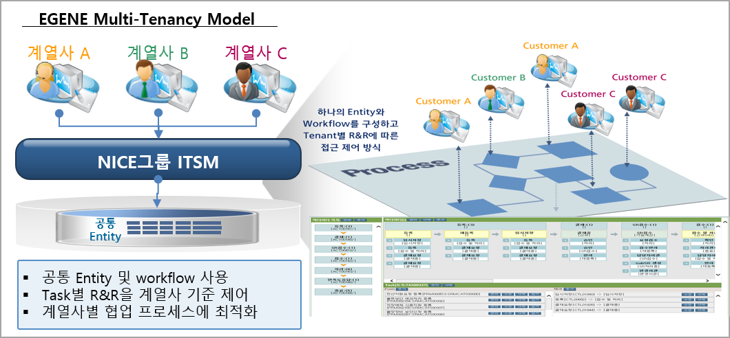 NICE그룹은 국내 최대의 신용평가 및 정보제공 서비스 회사로, IT 운영 기반환경의 안정성은 신규 IDC 구축 및 정보시스템 통합을 통해 목표한 수준에 맞게 확보하였으나, 운영관리 체계, 절차 등에 있어서도 검증된 IT운영의 선진모델을 적용하여 전 그룹 차원의 IT부문 업무 효율을 제고하고 서비스 기반으로 IT 운영역량을 강화하고자 계열사 통합 ITSM 시스템을 구축하였다.계열사 통합 ITSM 시스템의 사용을 19개 계열사로 확대 적용하여 그룹사간 표준화된 업무처리와 운영의 투명성을 확보하였다. 또한 실시간성 이벤트/인시던트 처리업무 ITSM과 요청/장애/변경 등의 프로세스성 ITSM을 분리 구성하여 계열사의 확대/분리 시 유연한 적용이 가능한 관리체계를 구축하였다.