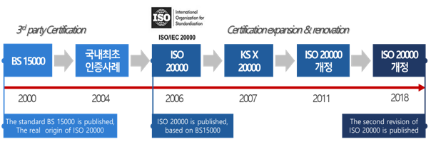 아래 History와 같이 ISO20000 규격은 2000년 BS15000으로 시작하여 세번의 변화가 진행되었다.
