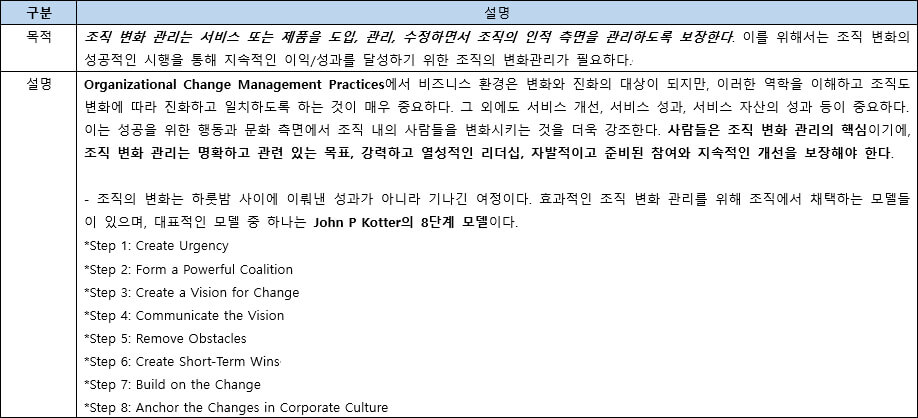 - 조직에서 제공하는 비즈니스 및 서비스의 성공을 위해 조직 전체에 적용할 수 있는 Practices로 이는 조직이 제공하는 서비스 또는 제품 유형에 관계없이 전체적으로 실시해야 할 견해를 제공한다.