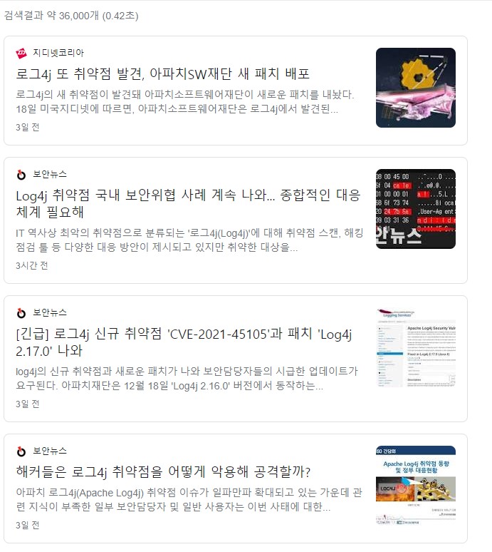 또한, 보안 이슈가 알려진 시점 전후에는 해당 취약점을 이용한 공격들이 많이 발생하기 때문에 빠른 조치가 필요하다. 하단의 검색내용과 같이 로그4J를 검색하면 수많은 관련 뉴스가 넘쳐날정도록 핫 이슈가 된 상황이다.