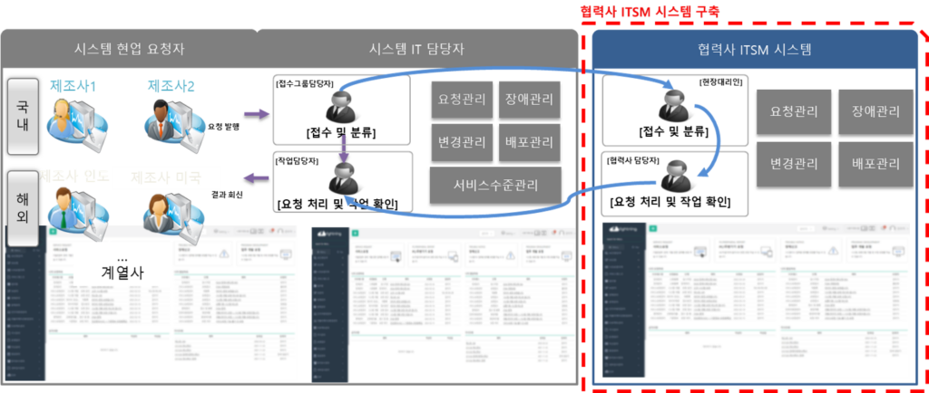 상기 흐름에서와 같이 ITSM 에선 현업은 평소대로 요청등록을 할 경우 자동으로 협력사 ITSM 시스템에 동일한 요청 건이 등록된다. 요청접수는 반드시 현장 대리인이 접수하도록 설정되어 있고, 그 뒤부턴 협력사 처리자가 진행하여 모든 처리가 종료될 경우 자동으로 ITSM에 처리내용이 전달되어 요청자가 내용 확인 후 종료할 수 있다.