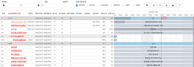 효과적인 일정 관리를 위해 솔루션에 탑재된 표준 방법론에 따라 WBS 공정을 제공하며, 세부 공정에 대한 추가 및 수정을 진행할 수 있다. 각 공정에 따른 진행 상태를 가시적으로 볼 수 있도록 Gantt Chart를 제공하며, 계획시작일, 계획종료일을 기준으로 총기간, 총작업량, 계획작업량을 자동 계산하고, 이에 따른 계획(%)/실적(%)과 작업진척률을 확인할 수 있다.