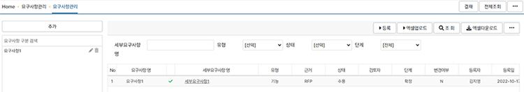 프로젝트에서 정의된 요구사항을 등록하고 관리할 수 있다. 그룹화된 상위 요구사항을 등록 후 세부요구사항을 등록할 수 있으며, 세부요구사항은 ‘등록>합의검토>결재>확정’의 절차로 진행되며, 결재자 승인 완료 건을 기준으로 확정된다.