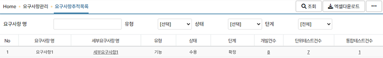 확정된 요구사항은 개발목록 및 테스트시나리오 기능과 연결되어, 실제 요구사항이 어떻게 구현되고 진행되는지에 대한 요구사항추적의 정보를 가시적으로 제공한다.