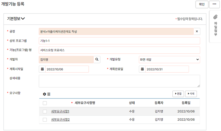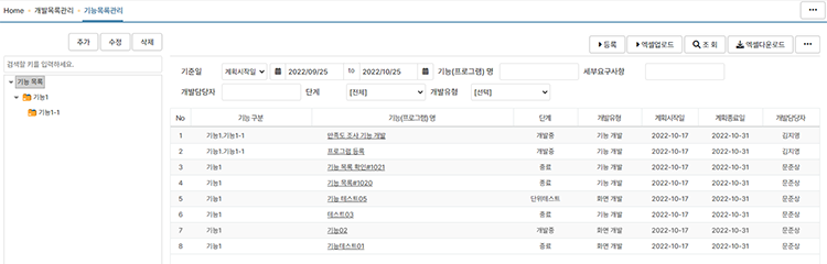 프로젝트 요구사항에 대한 기능별 개발 목록을 관리할 수 있다. 각 기능별로 상위 기능에 따른 기능(프로그램-개발목록)을 등록할 수 있다.