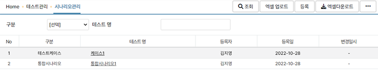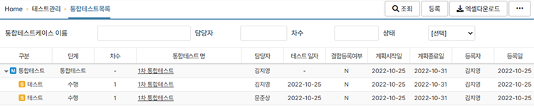 통합테스트는 ‘등록>통합테스트>테스트검토>(결함)>테스트검토>종료’의 절차로 진행되며, 테스트 실패 건이 있으면 결함관리 프로세스로 진행되어 결함의 처리 후 테스트가 완료 될 수 있도록 관련 기능을 제공한다.