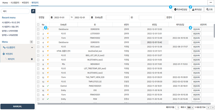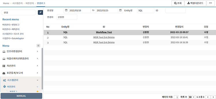 메타데이터의 변경이력을 조회할 수 있는 화면이며 변경일, 엔터티명, 변경된 ID, 변경자에 대한 정보를 제공한다.
