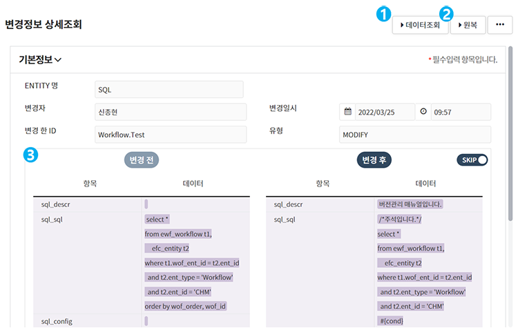 ■ 메타데이터를 변경 후 데이터로 원복 하는 기능이다.