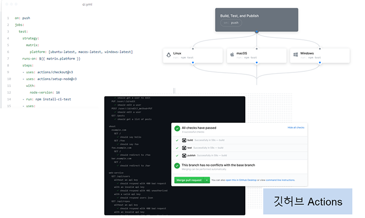 또 다른 제품으로는 깃 허브 “Actions” 의 경우 자동 배포에 필요한 기능을 설정만으로 실행 순서, 실행 기준, 반복 설정 등을 작성할 수 있으며, 많은 사용자가 깃 허브 “Actions”을 통해 전문 지식이 없어도 유연한 CI/CD 기능을 생성할 수 있다.
