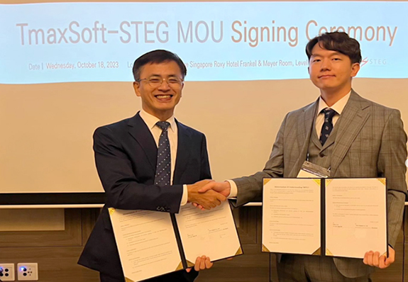 김성중 티맥스소프트 싱가포르 법인장(왼쪽)과 박건 STEG 차장(전 배화여대 겸임교수)은 최근 ‘ITSM 솔루션 APAC 지역 확산 업무협약(MOU) 세레모니를 했다. 에스티이지는 지난 18일 KOIIA가 주관한 ‘2023 글로벌 비즈니스 라운드테이블’에서 기업용 SW전문기업 티맥스소프트 싱가포르 법인과 ‘APAC 지역 IT서비스관리(ITSM) 솔루션 확산을 위한 업무협약(MOU)’을 체결했다. 이번 협약은 APAC 지역 기업에 양사 솔루션을 패키지 형태로 제공하기 위해 마련됐다. △에스티이지의 ITSM ‘이진(E-GENE) ITSM’ 등과 티맥스소프트의 웹애플리케이션서버(WAS) ‘제우스’ 등 간의 연동 개발·비즈니스 모형화 △아태 지역 공동 사업 추진 △파트너사 협업 등의 내용을 담고 있다.