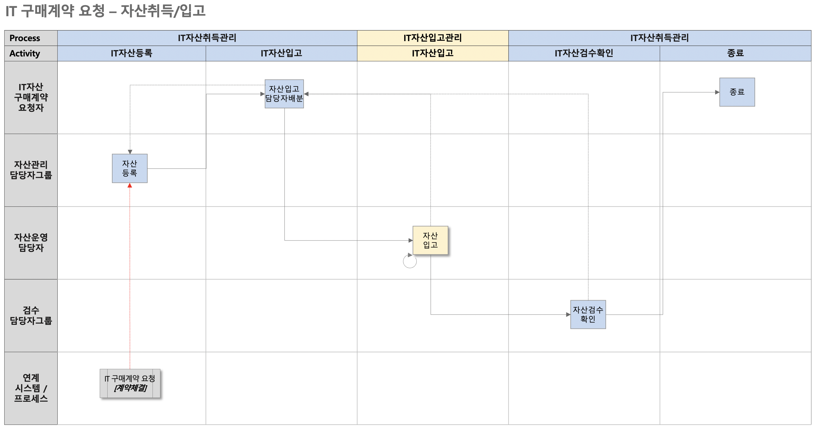 먼저 IT 구매계약의 경우 자산관리 프로세스의 시작이 되는 프로세스로 자산에 대한 구매, 계약, 취득, 입고 프로세스로 구성되어 있으며 순서대로 진행된다.