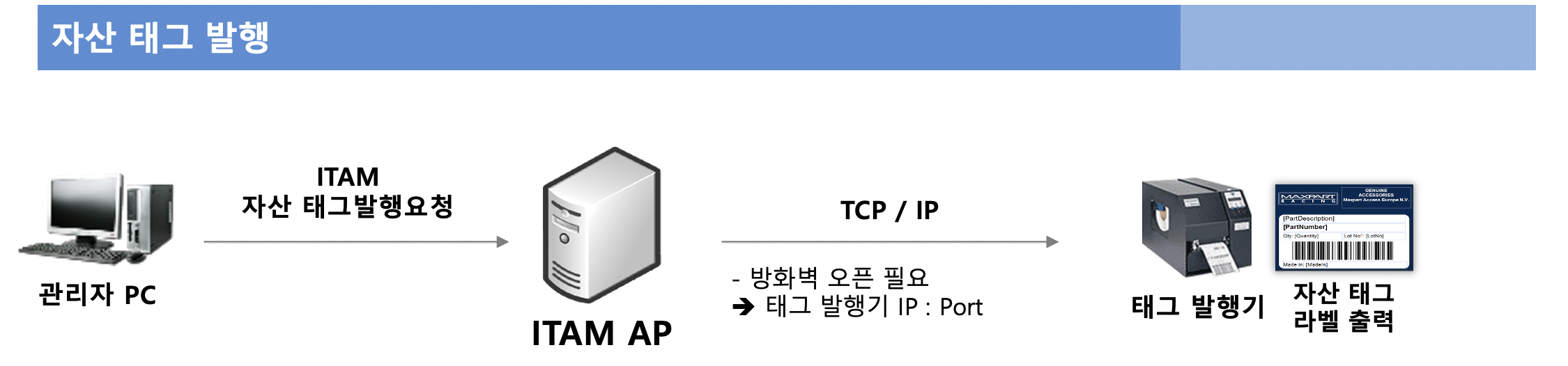 IT 자산 태그발행은 자산 실사 시 자산을 직접 눈으로 일일이 확인하여 진행하는 경우 시간이 많이 소요되기 때문에 전자인식이 가능한 RFID(Radio-Frequency Identification) 태그를 자산에 붙이고 RFID 태그를 인식할 수 있는 RFID PDA로 실사를 진행하여 소요시간을 줄이고 효율적인 실사 진행을 할 수 있게 RFID 태그를 발행하는 프로세스이다.