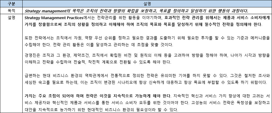 14 가지 General management practices은 모든 서비스에서 공통적으로 고려되며 조직 전체에 적용할 수 있는 practices로 이는 조직이 제공하는 서비스 또는 제품 유형에 관계없이 전체적으로 수행해야 할 견해를 제공한다.