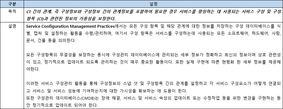 17가지 Service management practices는 조직 환경에서 개발, 배포, 제공 및 지원되는 특정 서비스에 적용할 수 있는 Practices로 모든 서비스에 대해 고려되며 구체적으로 서비스에 적용할 수 있다. 이는 서비스 및 제품을 관리하면서 전체적으로 실시해야 할 견해를 제공한다.