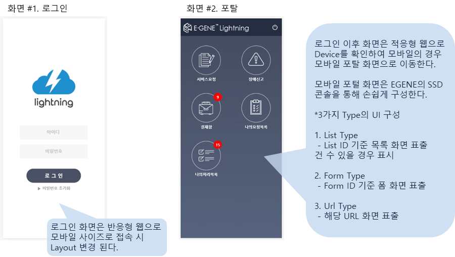 상기 정의한 사용자 Needs를 기반으로 EGENE ITSM 솔루션에 모바일 기능을 적용했으며 ITSM 모바일 포탈을 통해 ITSM의 전반적인 업무를 할 수 있도록 제공하고 있다.