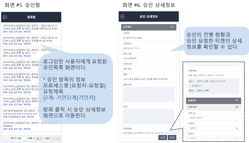 - 승인요청 내용과 프로세스 진행 내용을 바로 확인하고 승인 및 반려할 수 있어야 한다.