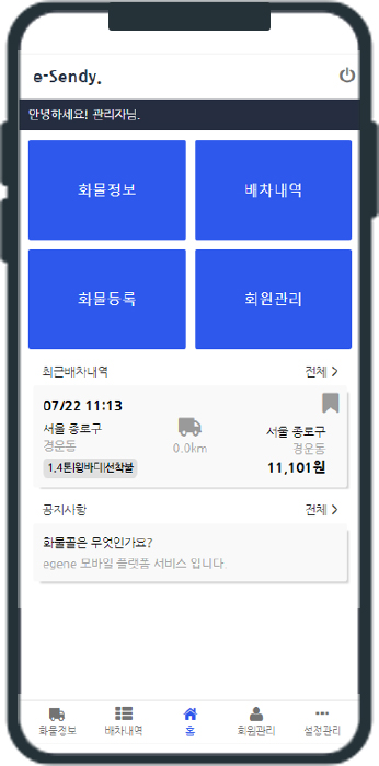 *특징: 맨 상단부분인 [안녕하세요!화주님]은 접속한사람이 누구인지 알수있도록 사용자 정보성과