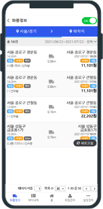 *특징: 화주,차주 모두 화물 등록을 할 수 있고, 자신이 등록된 내역을 확인 할 수 있는 화면으로