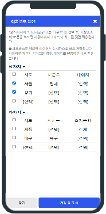 사용자가 자주 사용하는 지역 및 옵션들을 [화물정보 설정]에서 개인화하여 설정 할 수 있다.