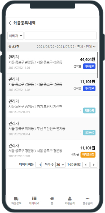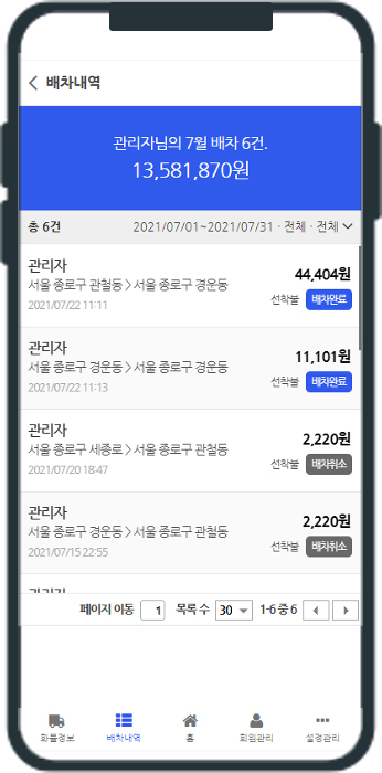 *특징: 사용자가 처리한 이력정보를 보여주는 기능으로 기본 값은 한달동안 한 배차 내역의 건수/금액이 상단에 보여지도록 정보를 제공한다.