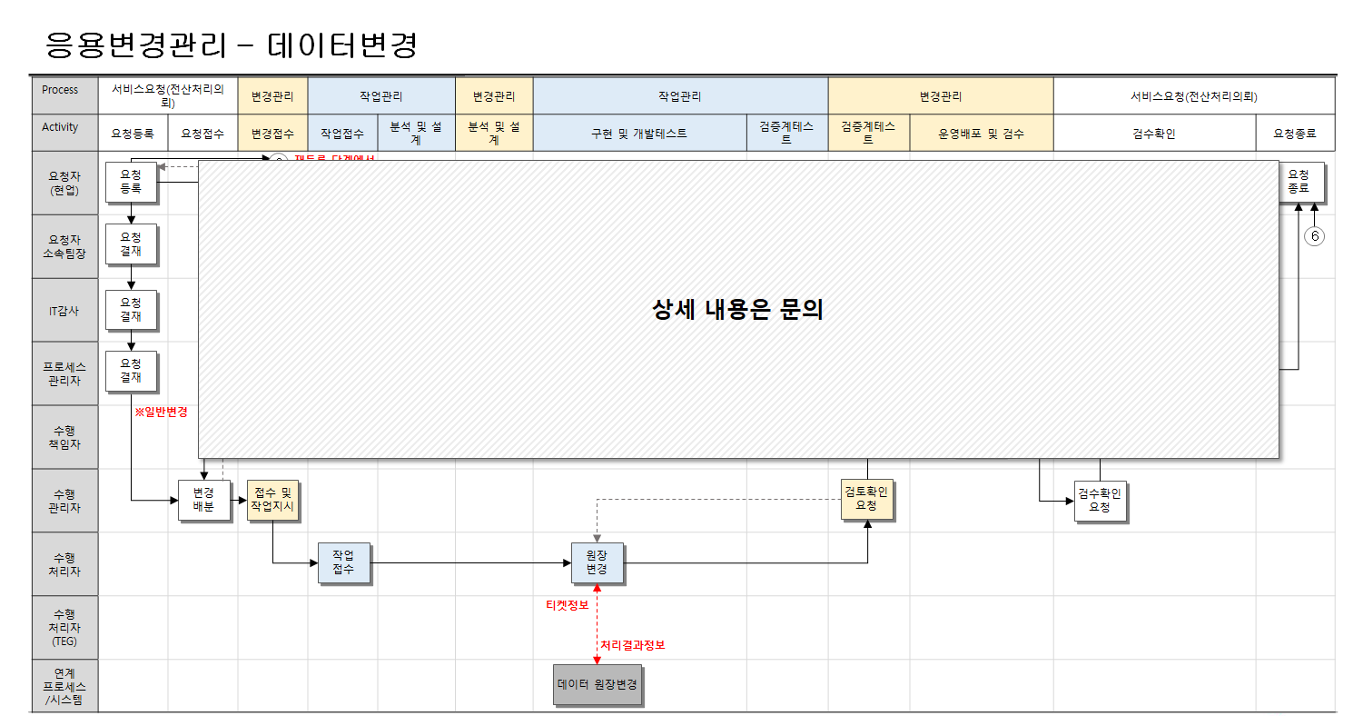 IT감사인 등 결재에 대한 부분은 강화되나 전반적인 프로세스 절차는 개발의뢰에 비해 단순하며프로세스 진행 중 데이터 원장변경 시스템과 연계가 이루어져 실제로 운영 데이터의 수정이 발생하게 된다.