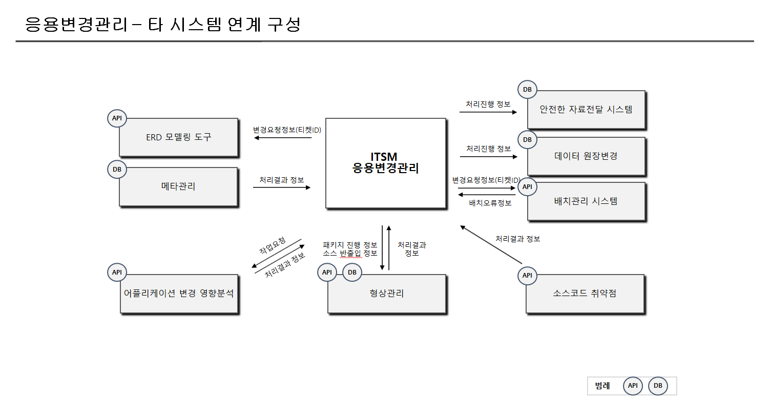 또한 ITSM 응용변경관리는 변경에 대한 프로세스적 절차를 담당하기에 실제 변경에 대한 다양한 기능의 수행을 위해 다양한 타 시스템과 연계가 이루어진다. 하기 그림과 같이 형상관리시스템 이외에도 메타, ERD모델링, 어플리케이션 영향분석, 소스취약점, 배치관리, 데이터원장변경, 자료전달 시스템등 여러 시스템들과 변경 프로세스내 필요한 단계에서 상호 연계를 수행하고 있다.