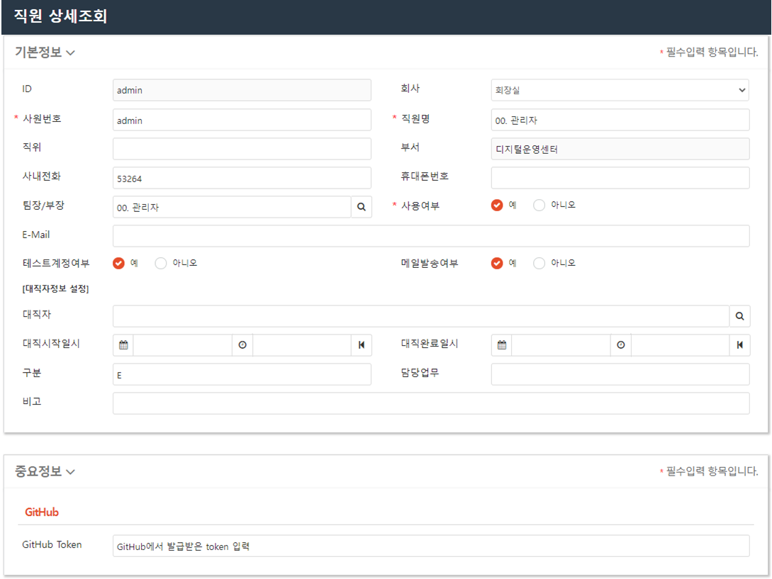 [그림3. GitHub token 정보 입력화면 예시]